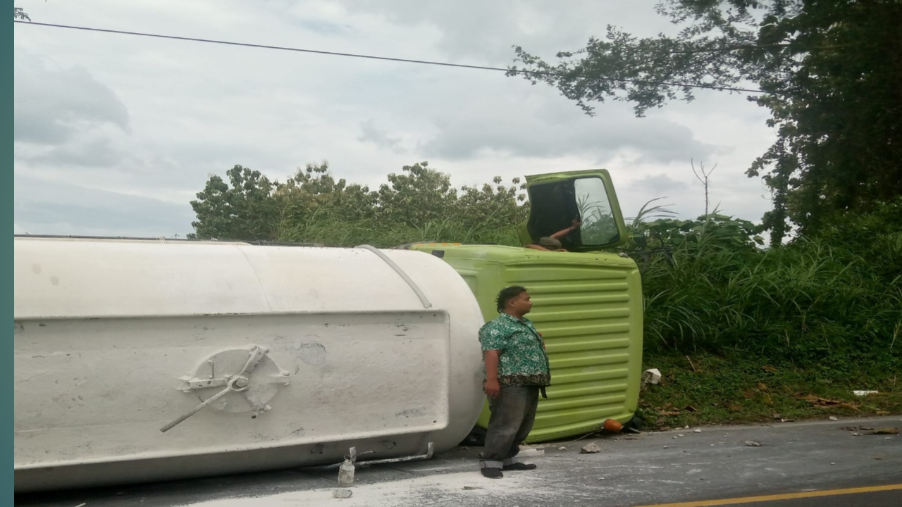 BLORA,SUARABLORA.COM – Kecelakaan tunggal melibatkan sebuah truk tronton bermuatan kapur curah terjadi di ruas jalan Nasional Blora-Cepu wilayah Ngawenan, Kecamatan Sambong, Kabupaten Blora, Sabtu (7/3/2026).