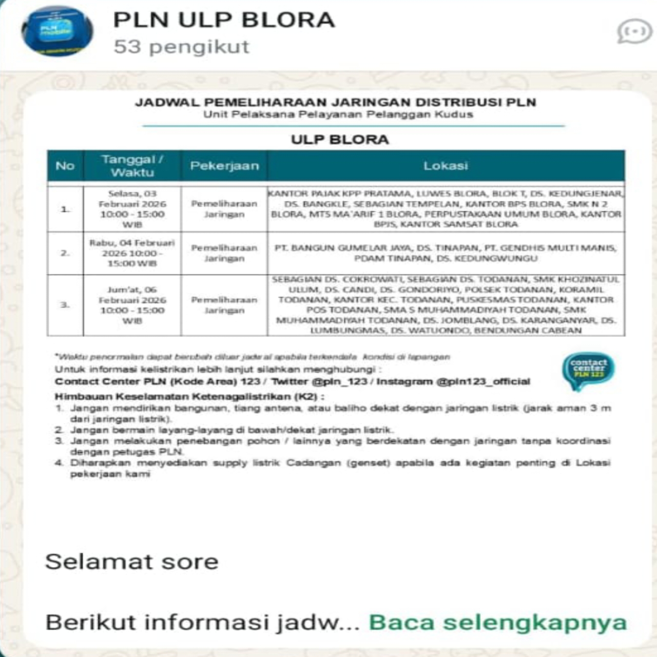 Informasi tersebut disampaikan melalui kanal resmi PLN ULP Blora dan menyebutkan bahwa pemeliharaan jaringan dilakukan guna menjaga keandalan sistem kelistrikan serta meningkatkan kualitas pelayanan kepada pelanggan.